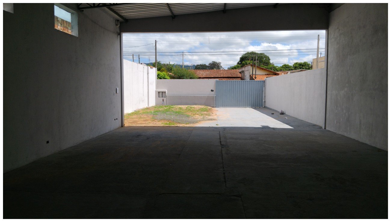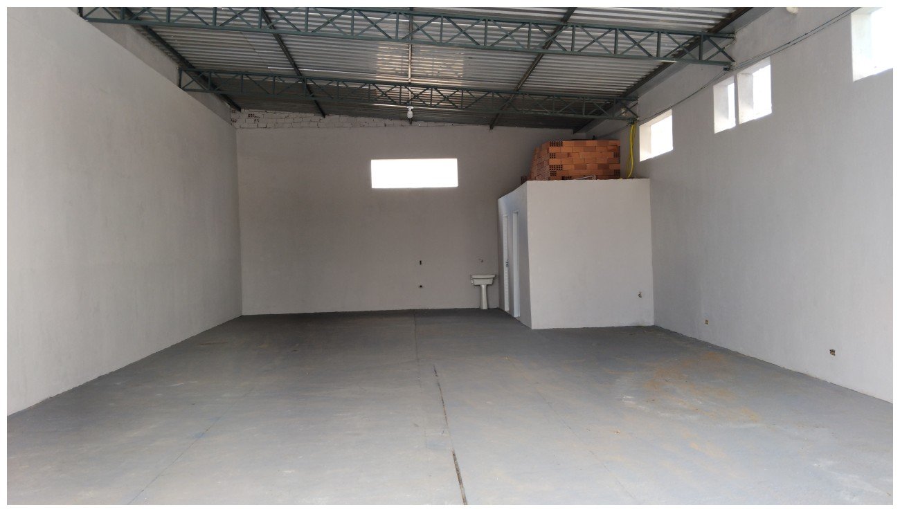 Galpão comercial com pé direito alto, área coberta com 2 banheiros, e terreno grande.